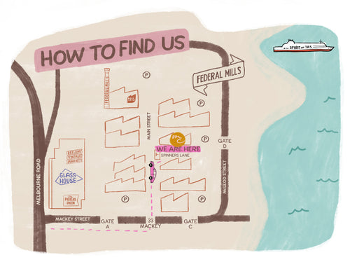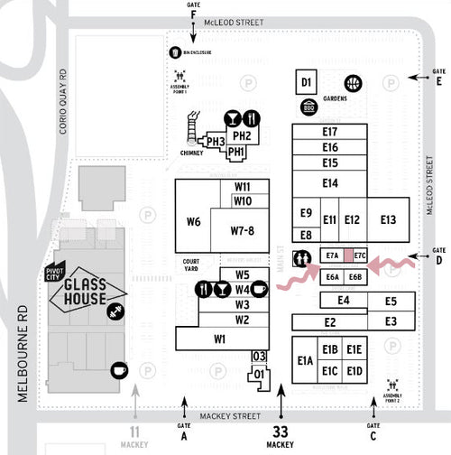 To locate our studio, enter via the main gate located on Mackey St, North Geelong. About 100m in from this gate you will see a section of car parks on the right-hand side, this is the closest parking to our studio. We are tenancy East 7B, and you’ll find us located on Spinners Lane – look for our Pink Sign with a big MC on it (there is also a random number 3 on our door!)